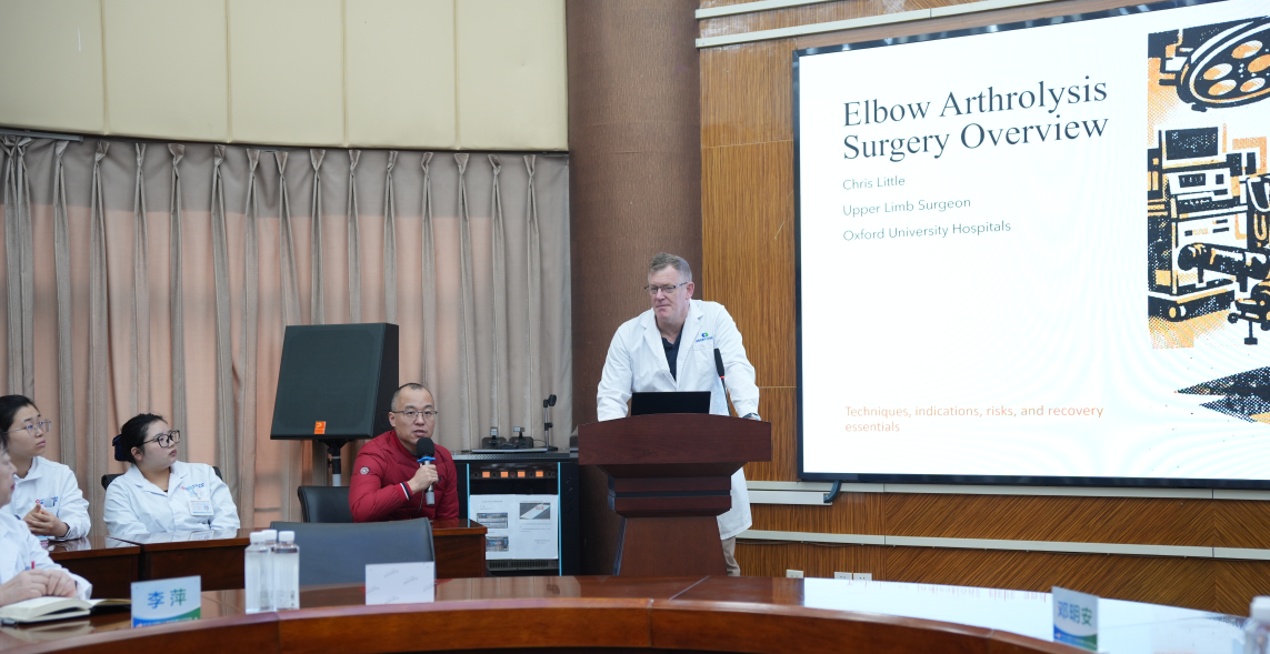 英国牛津克里斯·李拓(Christopher Paul Little)教授深耕关节外科多年,担任英国国民健康服务中南分布肘关节骨外科医学负责人,在关节微创修复、复杂损伤重建领域造诣深厚。讲座中,他围绕肘关节镜下诊疗前沿技术、规范流程及并发症防控,结合临床案例解析镜下肌腱修复、关节松解等关键技术,分享全球关节微创发展趋势,强调 “微创精准 + 功能优先” 理念,为成都显微手足外科医院医护人员带来国际化临床思维启发。